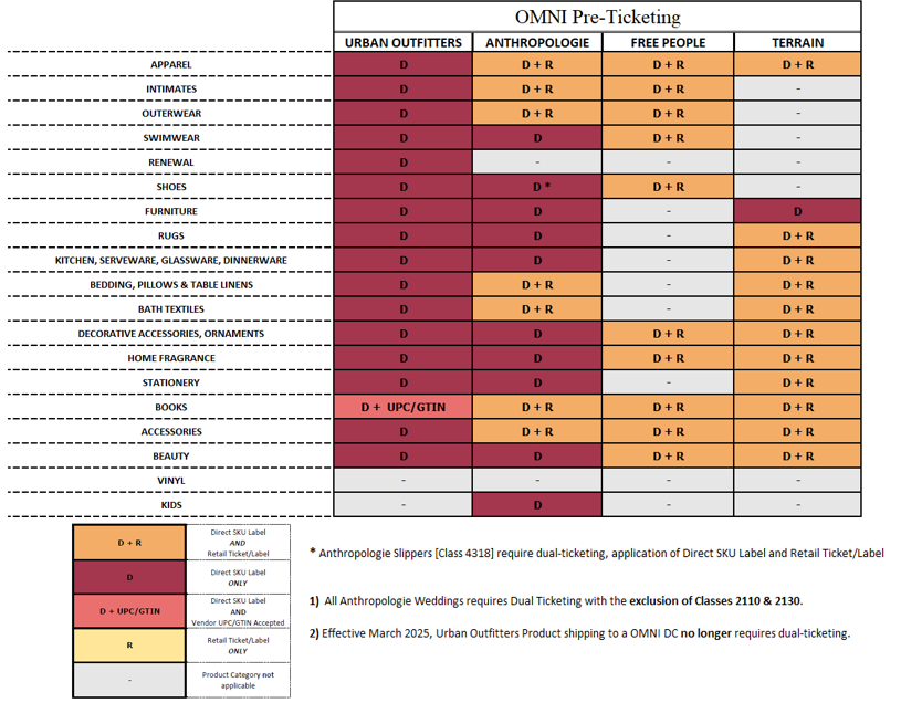 As stated above, Dual-Ticketing (Retail ticket/label AND 3×3 Direct Label) is required for Omni POs, however there are product category exceptions.